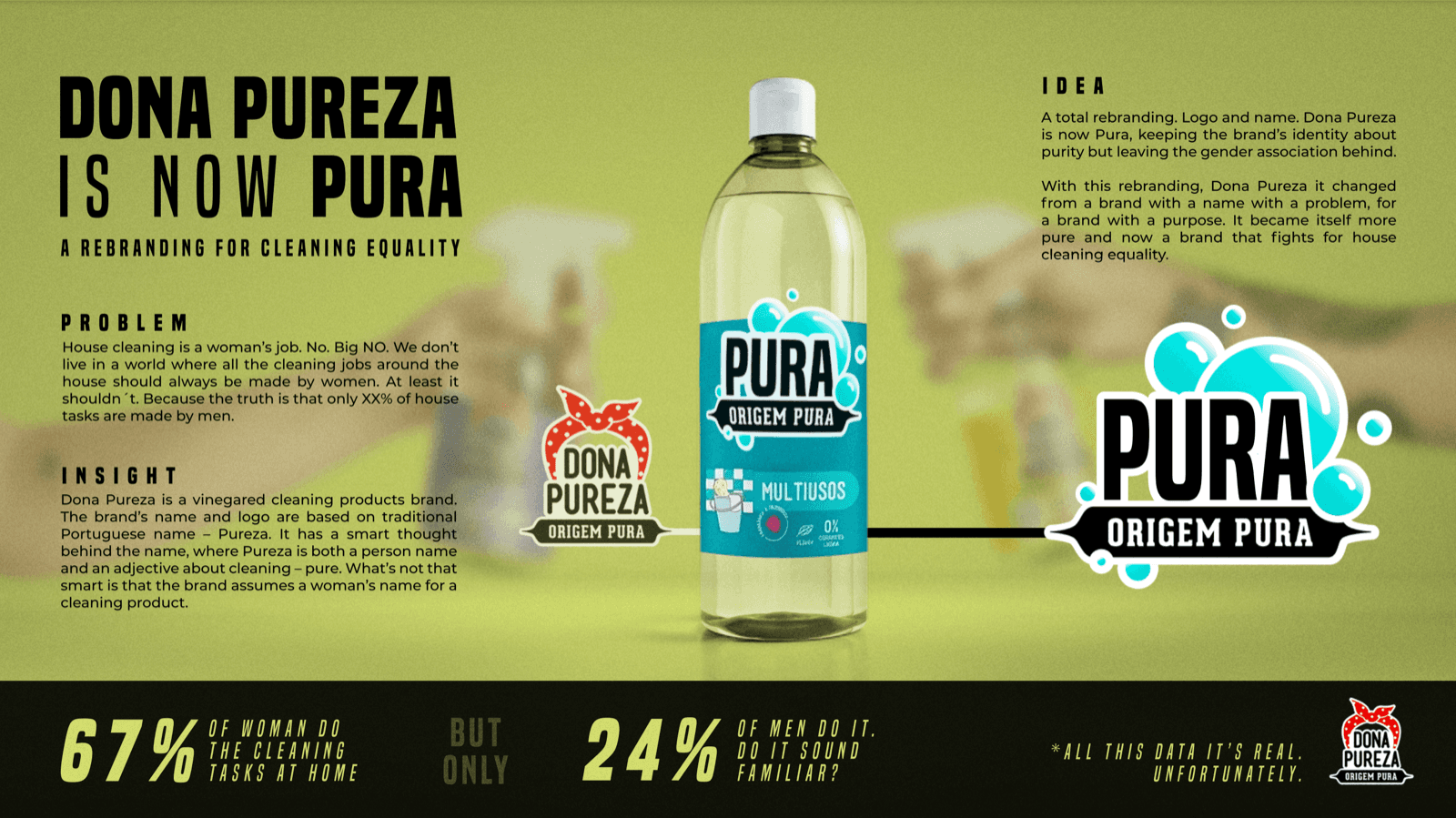 Dona Pureza is a vinegared cleaning products brand. The brand’s name and logo are based on traditional Portuguese name – Pureza. It has a smart thought behind the name, where Pureza is both a person name and an adjective about cleaning – pure. What’s not that smart is that the brand assumes a woman’s name for a cleaning product. A total rebranding. Logo and name. Dona Pureza is now Pura