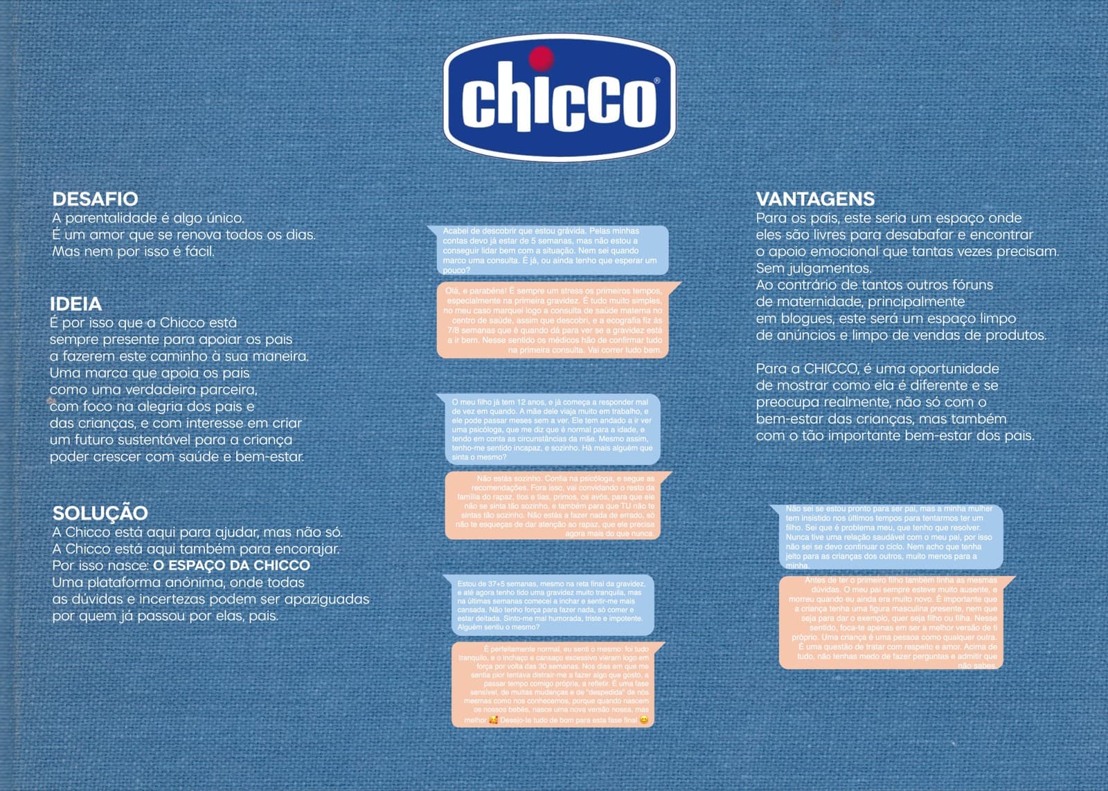 O "ESPAÇO DA CHICCO" é um projeto para a Chicco que oferece apoio emocional aos pais, proporcionando um ambiente anónimo de partilha de experiências e obtenção de conselhos. Pretende ser um espaço livre de julgamentos, onde não há anúncios ou quebras de diálogo de patrocinadores. Destaca a nosso entender o compromisso da Chicco com o bem-estar dos pais e fortalece a conexão entre a marca e os seus clientes.