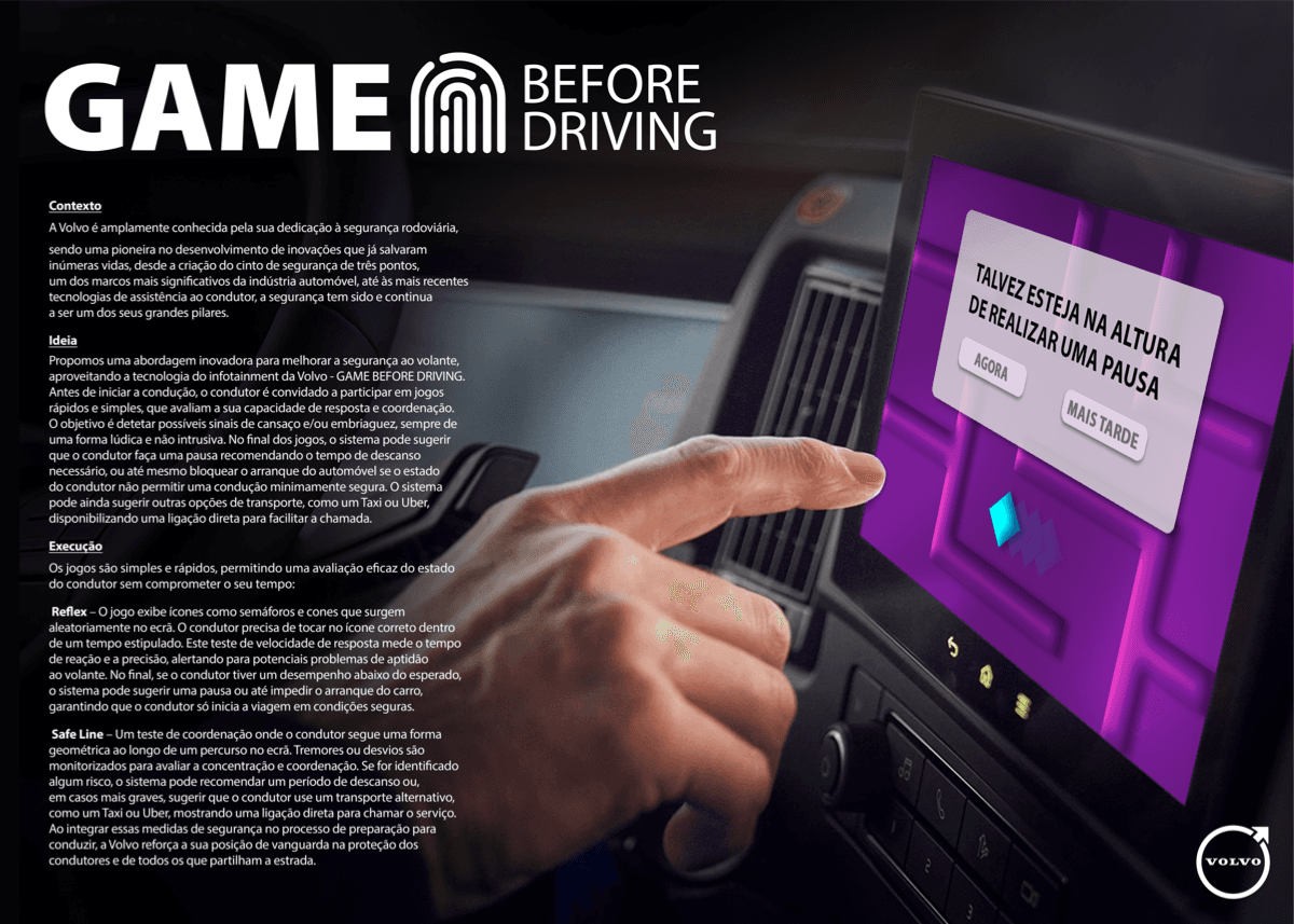 Propomos uma abordagem inovadora para melhorar a segurança ao volante, aproveitando a tecnologia do infotainment da Volvo - GAME BEFORE DRIVING. Antes de iniciar a condução, o condutor é convidado a participar em jogos rápidos e simples, que avaliam a sua capacidade de resposta e coordenação. O objetivo é detetar possíveis sinais de cansaço e/ou embriaguez, sempre de uma forma lúdica e não intrusiva. No final dos jogos, o sistema pode sugerir que o condutor faça uma pausa recomendando o tempo de descanso necessário, ou até mesmo bloquear o arranque do automóvel se o estado do condutor não permitir uma condução minimamente segura. O sistema pode ainda sugerir outras opções de transporte, como um Taxi ou Uber, disponibilizando uma ligação direta para facilitar a chamada.
