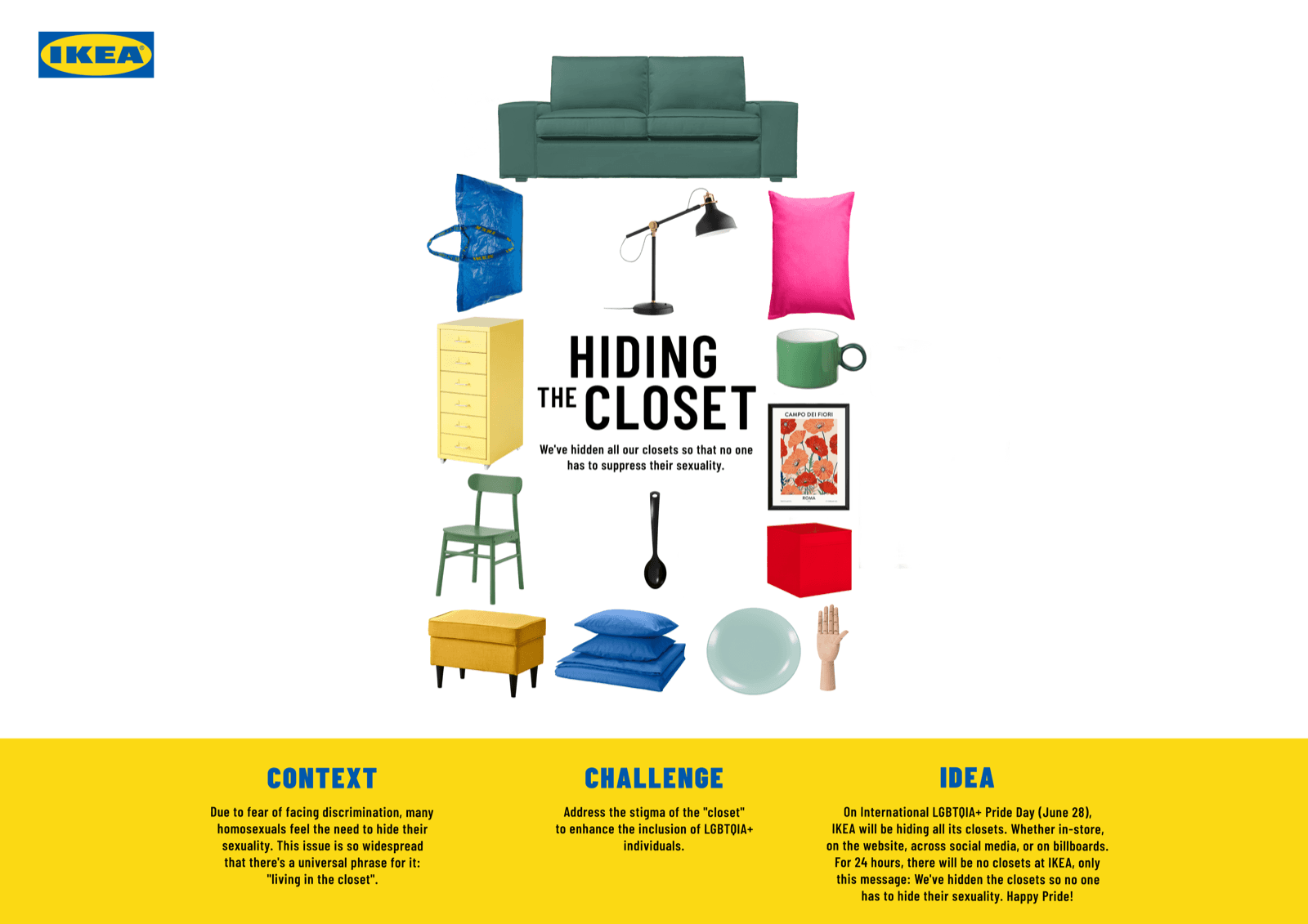 Due to fear of facing discrimination, many homosexuals feel the need to hide their sexuality. This issue is so widespread that there's a universal phrase for it: "living in the closet". On International LGBTQIA+ Pride Day (June 28), IKEA will be hiding all its closets. Whether in-store, on the website, across social media, or on billboards. For 24 hours, there will be no closets at IKEA, only this message: We've hidden the closets so no one has to hide their sexuality. Happy Pride!