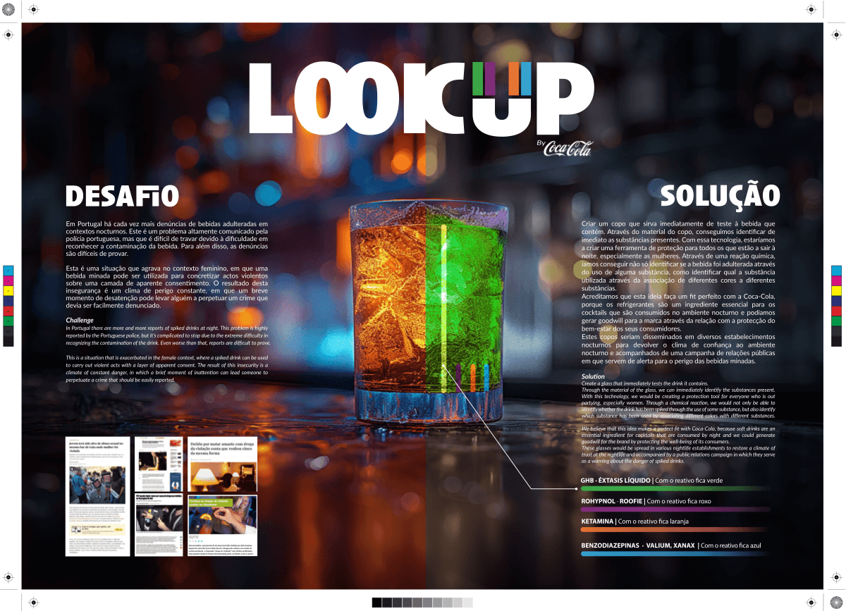 In Portugal, there is a growing number of reports about spiked drinks at night. Even when this problem is highly communicated by the Portuguese police, it's very complicated to stop it due to the extreme difficulty in recognizing the contamination of the drink. In our ideia, we propose the creation of a glass that immediately tests the drink it contains. Throught the material of the glasse, we can immediately identify substances present in the drink. We believe that this idea makes a perfect fit with Coca-Cola, because soft drinks are an essential ingredient for cocktails that are consumed by night and we could generate goodwill for the brand by protecting the well-being of its consumers.