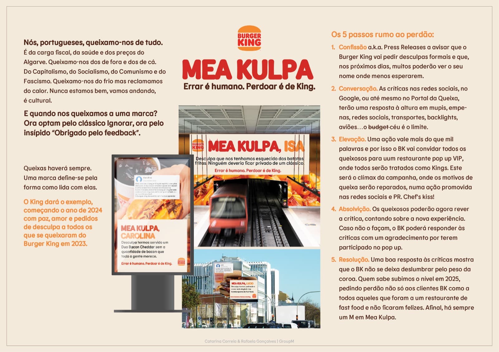 Nós, portugueses, queixamo-nos de tudo. É da carga fiscal, da saúde e dos preços do Algarve. Queixamo-nos dos de fora e dos de cá. Do Socialismo, do Comunismo e do Fascismo. Queixamo-nos do frio mas reclamamos do calor. Nunca estamos bem, vamos andando, é cultural. E quando nos queixamos a uma marca? Ora optam pelo clássico Ignorar, ora pelo insípido “Obrigado pelo feedback”. Queixas haverá sempre. Uma marca define-se pela forma como lida com elas. O King dará o exemplo, começando o ano de 2024 com paz, amor e pedidos de desculpa a todos aqueles que se queixaram do Burger King em 2023. Os 5 passos rumo ao perdão: 1. Confissão a.k.a. Press Releases a avisar que o Burger King vai pedir desculpas formais e que, nos dias seguintes, muitos poderão ver o seu nome onde menos esperam. 2. Conversação. As críticas das redes sociais, do Google, ou até mesmo do Portal da Queixa, terão uma resposta à altura em mupis, empenas, redes sociais, transportes, backlights, aviões…o budget céu é o limite. 3. Elevação. Uma ação vale mais do que mil palavras e por isso o BK vai convidar todos os queixosos para um restaurante pop up VIP, onde todos serão tratados como Kings. Este será o clímax da campanha, onde os motivos de queixa serão reparados, numa experiência promovida nas redes sociais e PR. Chef's kiss! 4. Absolvição. Os queixosos poderão rever a crítica, contando sobre a nova experiência. Caso não o façam, o BK poderá responder às críticas com um agradecimento por terem participado no pop up. 5. Resolução. Uma boa resposta às críticas mostra que a marca que não se deixa deslumbrar pelo peso da coroa. Quem sabe subimos o nível em 2025, pedindo perdão não só aos clientes BK mas a todos aqueles que foram a um restaurante de fast food e não ficaram felizes. Afinal, há sempre um M em Mea Kulpa.