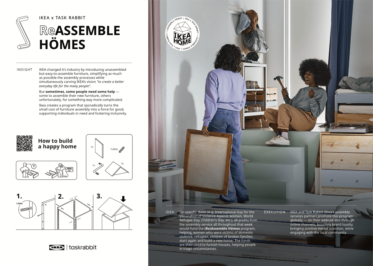 IKEA changed it’s industry by introducing unassembled but easy-to-assemble furniture, simplifying as much as possible the assembly processes while simultaneously carving IKEA’s vision "to create a better everyday life for the many people”. But sometimes, some people need some help — some to assemble their new furniture, others unfortunately, for something way more complicated. Ikea creates a program that sporadically turns the small cost of furniture assembly into a force for good, supporting individuals in need and fostering inclusivity.