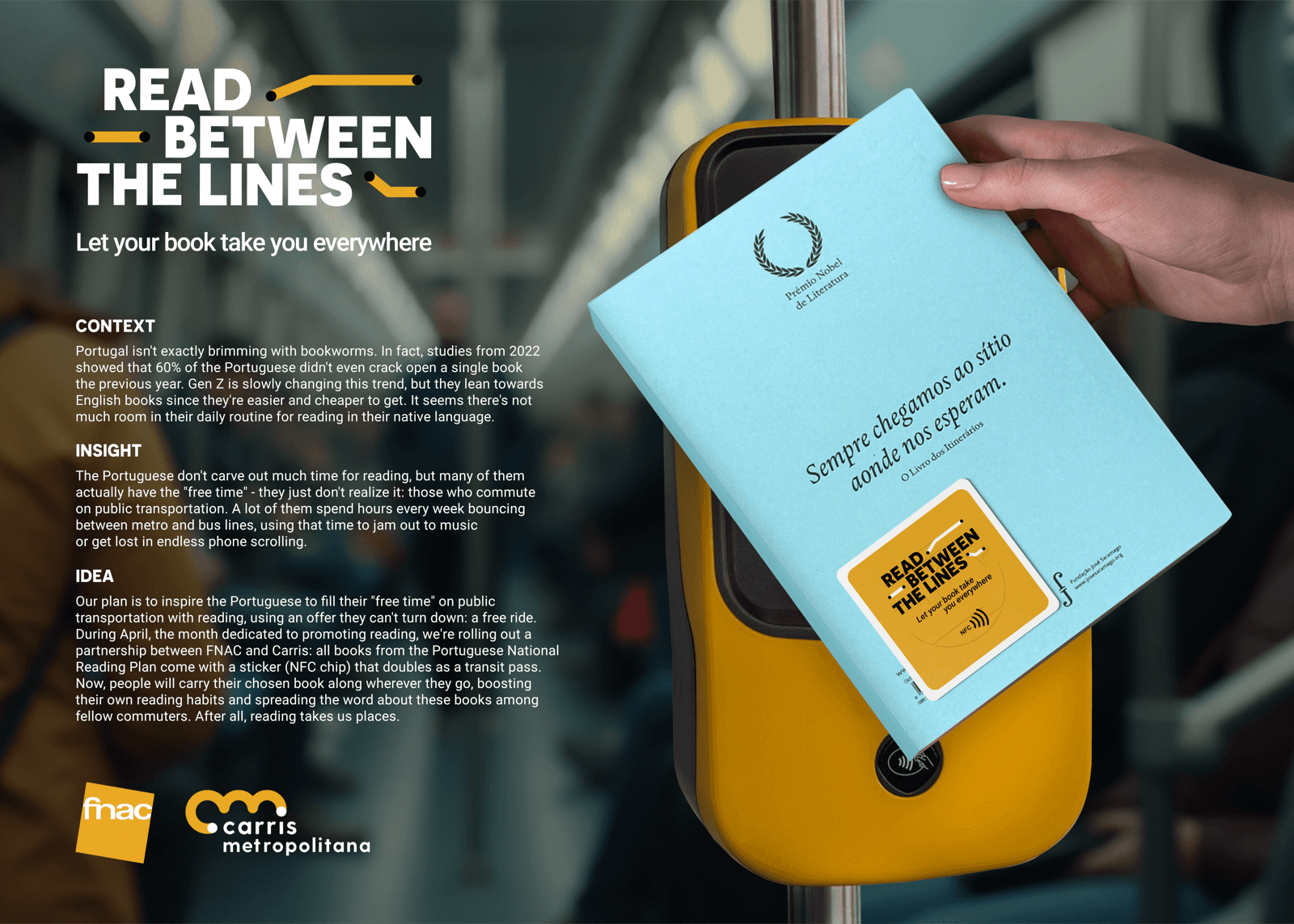 Our plan is to inspire the Portuguese to fill their "free time" on public transportation with reading, using an offer they can't turn down: a free ride. During April, the month dedicated to promoting reading, we're rolling out a partnership between FNAC and Carris: all books from the Portuguese National Reading Plan come with a sticker (NFC chip) that doubles as a transit pass. Now, people will carry their chosen book along wherever they go, boosting their own reading habits and spreading the word about these books among fellow commuters. After all, reading takes us places.