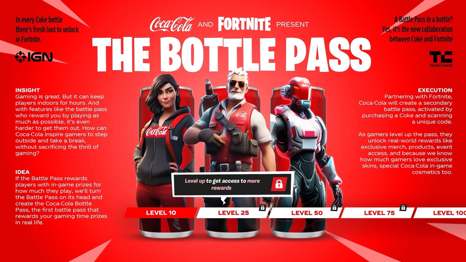 Gaming is great. But it can keep players indoors for hours. And with features like the battle pass who reward you by playing as much as possible, it’s even harder to get them out. How can Coca-Cola inspire gamers to step outside and take a break, without sacrificing the thrill of gaming? If the Battle Pass rewards players with in-game prizes for how much they play, we’ll turn the Battle Pass on its head and create the Coca-Cola Bottle Pass, the first battle pass that rewards your gaming time prizes in real life.