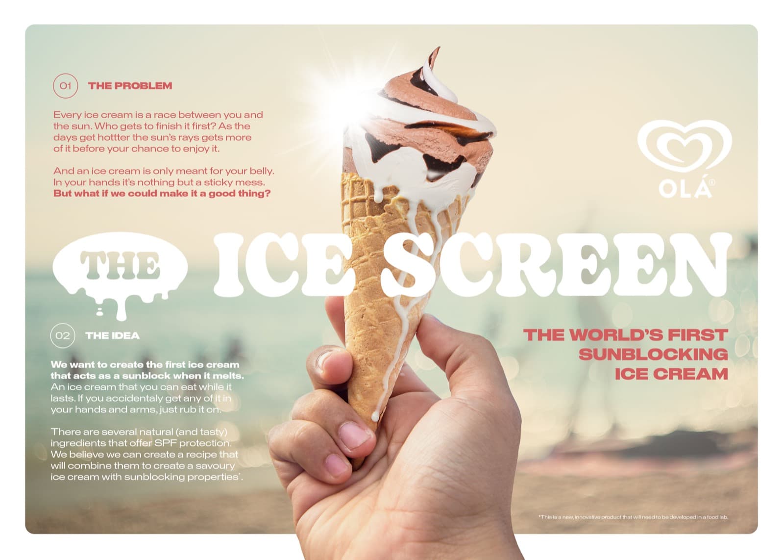 The World's First Sunblocking Ice Cream: as summer approaches, the experience of enjoying a delicious ice cream can be ruined by the stress of having to finish it before it melts in the sun. But what if we could make that a good thing? Olá presents the first ice cream that acts as a sunblock when it melts - with natural SPF protecting ingredients and delicious creamy flavors.