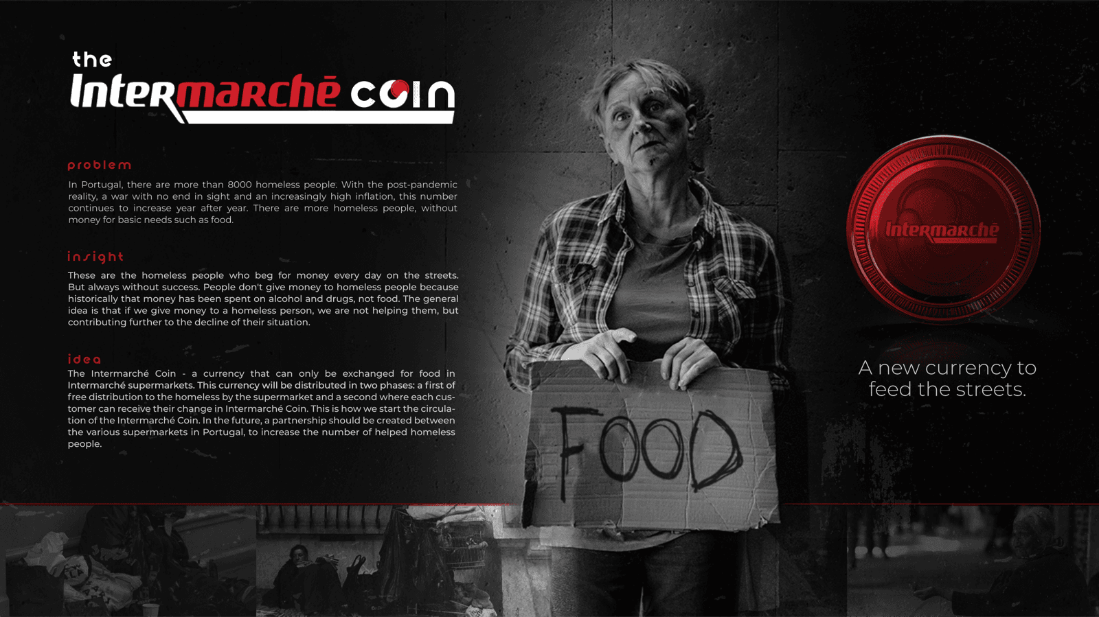 Homeless people beg for money every day on the streets. But always without success. People don't give money to homeless people because historically that money has been spent on alcohol and drugs, not food. The Intermarché Coin - a currency that can only be exchanged for food in Intermarché supermarkets.