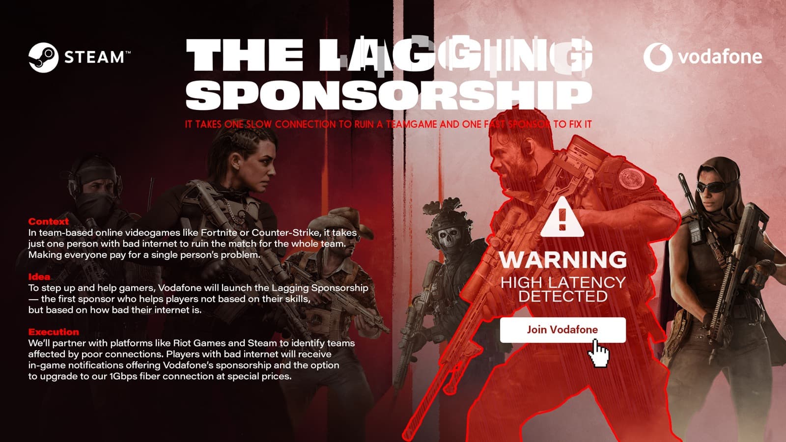In team-based online videogames like Fortnite or Counter-Strike, it takesjust one person with bad internet to ruin the match for the whole team. Making everyone pay for a single person’s problem. To step up and help gamers, Vodafone will launch the Lagging Sponsorship — the first sponsor who helps players not based on their skills, but based on how bad their internet is.