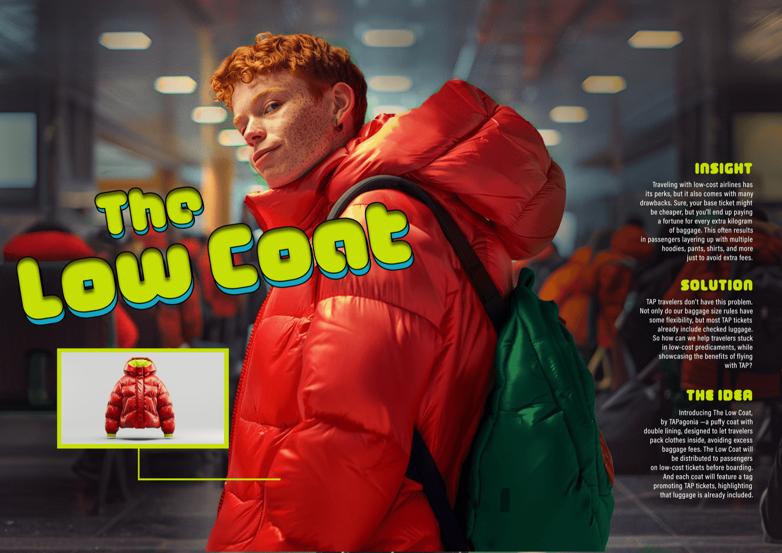 Traveling with low-cost airlines hasits perks, but it also comes with many drawbacks. Sure, your base ticket might be cheaper, but you'll end up paying a fortune for every extra kilogram of baggage. This often results in passengers layering up with multiple hoodies, pants, shirts, and more just to avoid extra fees. TAP travelers don’t have this problem. Not only do our baggage size rules have some flexibility, but most TAP tickets already include checked luggage. So how can we help travelers stuck in low-cost predicaments, while showcasing the benefits of flying with TAP? Introducing The Low Coat, by TAPagonia —a puffy coat with double lining, designed to let travelers pack clothes inside, avoiding excess baggage fees. The Low Coat will be distributed to passengers on low-cost tickets before boarding. And each coat will feature a tag promoting TAP tickets, highlighting that luggage is already included.
