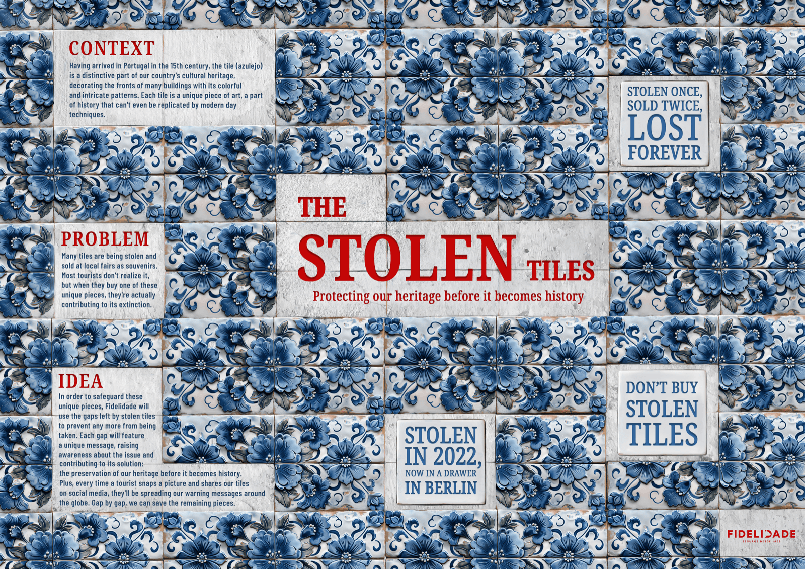 Having arrived in Portugal in the 15th century, the tile (azulejo) is a distinctive part of our country's cultural heritage, decorating the fronts of many buildings with its colorful and intricate patterns. Each tile is a unique piece of art, a part of history that can't even be replicated by modern day techniques. Many tiles are being stolen and sold at local fairs as souvenirs. Most tourists don't realize it, but when they buy one of these unique pieces, they're actually contributing to its extinction. In order to safeguard these unique pieces, Fidelidade will use the gaps left by stolen tiles to prevent any more from being taken. Each gap will feature a unique message, raising awareness about the issue and contributing to its solution: the preservation of our heritage before it becomes history. Plus, every time a tourist snaps a picture and shares our tiles on social media, they'll be spreading our warning messages around the globe. Gap by gap, we can save the remaining pieces.