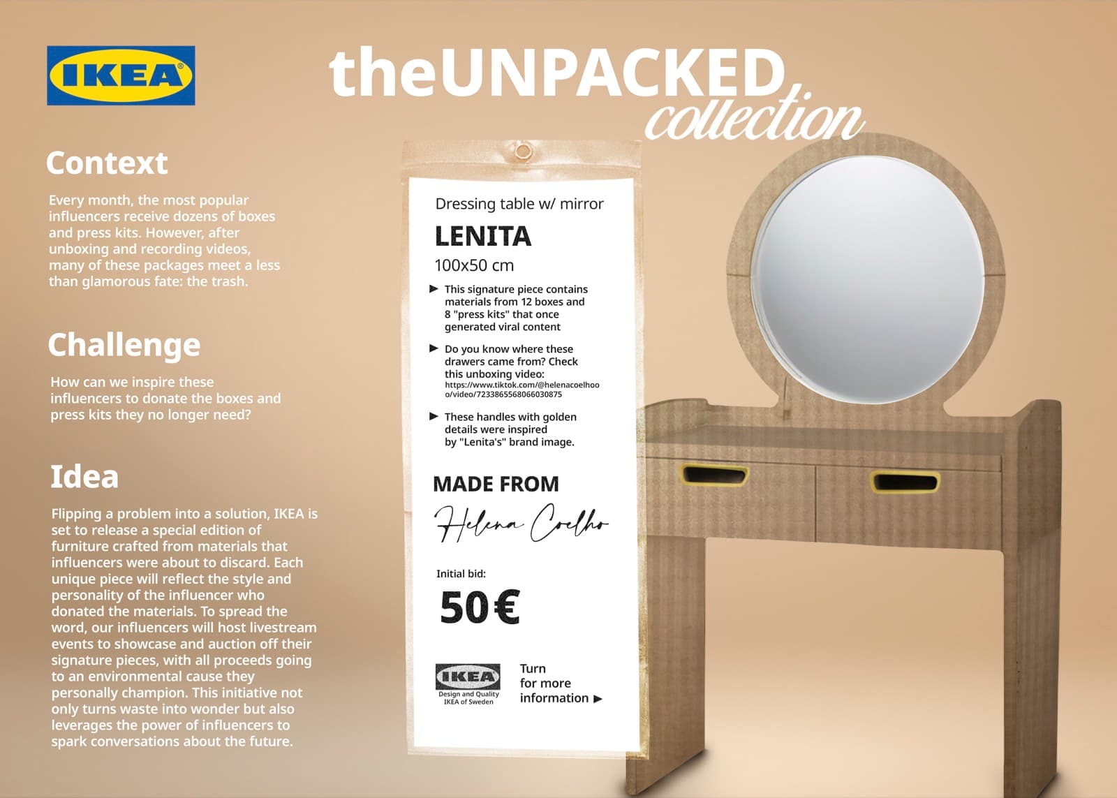 Context: Every month, the most popular influencers receive dozens of boxes and press kits. However, after unboxing and recording videos, many of these packages meet a less than glamorous fate: the trash. Challenge: How can we inspire these influencers to donate the boxes and press kits they no longer need? Idea: Flipping a problem into a solution, IKEA is set to release a special edition of furniture crafted from materials that influencers were about to discard. Each unique piece will reflect the style and personality of the influencer who donated the materials. To spread the word, our influencers will host livestream events to showcase and auction off their signature pieces, with all proceeds going to an environmental cause they personally champion. This initiative not only turns waste into wonder but also leverages the power of influencers to spark conversations about the future.